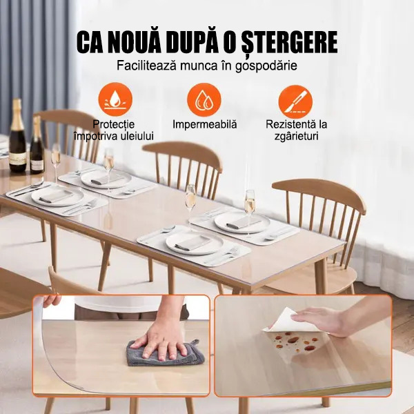 Actualizați-vă spațiul de luat masa cu fața noastră de masă premium din PVC. Proiectată pentru a menține masa în condiții impecabile, oferă protecție excepțională împotriva zgârieturilor, lichidelor vărsate și altele.