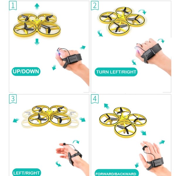 1. Urcare și coborâre: Apăsați butonul de pe deget. Drona va își va regla înălțimea în funcție de modificarea înălțimii brațului.