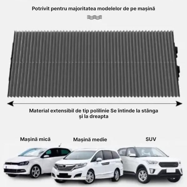 Acest parasolar este proiectat să se potrivească unei game largi de vehicule, inclusiv mașini, furgonete, camioane și SUV-uri. Este o potrivire universală deoarece puteți tăia lățimea la dimensiunea dorită.