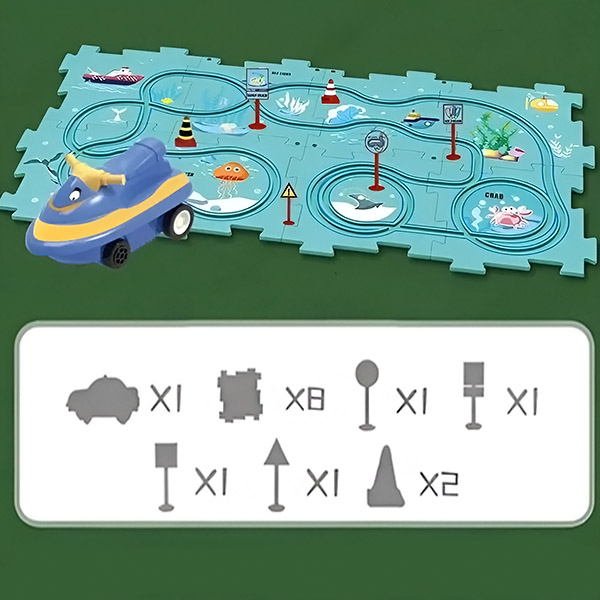 Setul include mai multe piese de circuit care le permit copiilor să creeze cu ușurință diferite amenajări, sporindu-le creativitatea și abilitățile de rezolvare a problemelor.